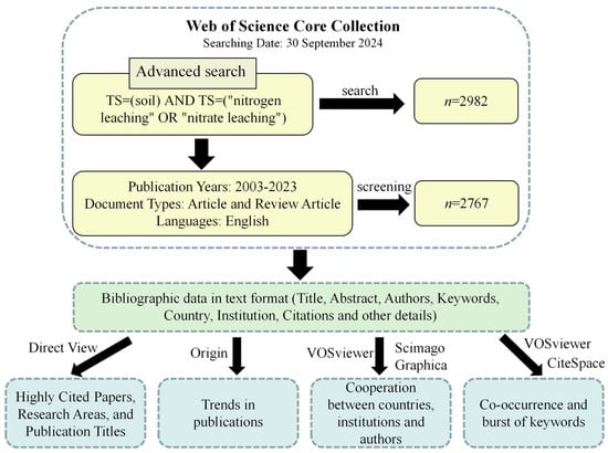 The Web of Science (WOS) database contains authoritative academic journals of the highest level in a wide range of fields such as natural sciences, engineering, and technology from all over the world, and WOS is the most commonly used database in the academic world, with a high degree of influence in the international arena. The publications in this study were obtained from the WOS Core Collection using the “Advanced search” function and subject (TS)-based citation indexing. The rules of Boolean logic operations were applied [31]: the operator “AND” was used to combine two terms, and the operator “OR” was used to include synonyms or near-synonyms of terms. Since soil nitrogen leaching is mainly dominated by nitrate nitrogen [32], “nitrogen leaching” and “nitrate leaching” are considered as close synonyms in this study; it was searched by “TS = (Soil) AND TS = (“Nitrogen Leaching” OR “Nitrate Leaching”)”. In the search, “nitrogen leaching” and “nitrate leaching” were enclosed in double quotes to indicate an exact search term. The search was conducted on 30 September 2024, spanning the period 2003–2023, with “Article” and “Review Article” selected as article types; the language of the articles was English (Figure 1). The bibliometric data were downloaded in text file format containing details such as title, abstract, authors, keywords, country, institution, number of citations, etc. The above data were then filtered by eliminating data from two or more identical publications to a single set, resulting in valid bibliometric data for 2767 publications.