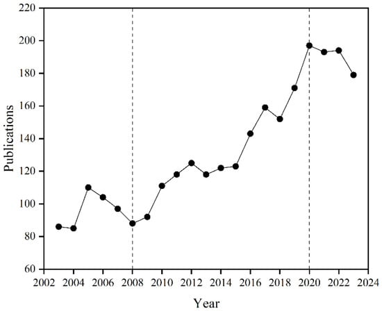 As can be seen in Figure 2, the number of publications in the field of soil nitrogen leaching has exceeded 80 per year over the past 20 years, and the overall trend has been upward, indicating that there was already a certain research foundation in this field in 2003 and, at the same time, that it is still in the process of continuous development and progress. The research of almost 20 years can be divided into three phases, based on the publications issued each year. The first phase, from 2003 to 2008, focused on the effects of management measures, such as cover crops [35] and the use of nitrogen application [36] to control soil nitrogen leaching. The annual volume of publications in this phase fluctuates and does not grow significantly, indicating a slower development in this phase. The second phase, from 2008 to 2020, is a period of rapid growth in research output in the field, with an average increase of 9.1 articles per year and a peak of 197 articles in 2020. This is probably because as the world’s economies have continued to grow, the emphasis on sustainable agricultural development has gradually increased [37]; meanwhile, agricultural modelling has been further developed, and as the use of multiple process models of the terrestrial nitrogen cycle and metabolic models of agricultural crops has matured [38,39], there has been an increasing interest in nitrogen use efficiency. The third phase is after 2020, during which the number of annual publications stabilized at over 170. The number of publications issued in 2023 may be reduced by factors such as publication delays and lagging updates [40], but the overall change is not significant. This suggests that the research related to soil nitrogen leaching is relatively mature after 2020.