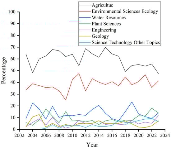 Based on the results of the WOS Core Collection, the annual number of publications was analyzed for research areas with more than 100 total publications (Figure 3). Studies have shown that soil nitrogen leaching is dominated by a single discipline, but the trend of multidisciplinary cross-research has begun to emerge gradually in recent years. A total of seven research areas had more than 100 publications, with agriculture and environmental sciences ecology consistently being the two areas with the highest number of publications; this is consistent with the findings of the journals in which they are published. The number of publications in the field of agriculture has remained in first place; before 2018, the number was basically maintained in more than 60% of the total number of publications (excluding individual years, Figure 3) and occupied a clearly dominant position, which indicates that the research in the field of soil nitrogen leaching represents the domination of a single discipline. Starting in 2018, the share of publications in the field of agriculture gradually declined and remained below 60%, while plant science showed a significant improvement over the more stable development of 2010–2017, and the number of publications in the field of science technology other topics also gradually increased from 0 before 2005 (Figure 3). These findings indicate that research on agriculture in the field of soil nitrogen leaching has decreased in recent years, and a trend of multidisciplinary cross-research has gradually begun to emerge. Multidisciplinary cross-disciplinary research is conducive to innovation and comprehensive development in the field of soil nitrogen leaching [41].