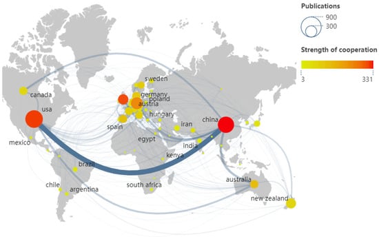 In addition, China and the USA have relatively close cooperation with countries such as Australia and Canada (Figure 5). China and Australia have collaborated on 33 publications, with studies covering the retaining of straw on a soil surface [56], water and nitrogen management in desert areas [57], soil environmental pollution in coastal watersheds [58], and the use of multiple agricultural models [51,59]. The USA and Australia collaborated on 28 publications, with the main research covering nitrogen fertilizer management [60], fungal regulation of nitrogen loss [61], microbial communities [62], and modelling analysis [63]. Twenty-six publications resulted from collaborations between China and Canada, with studies covering climate change [64], nitrogen fertilizer [65], management strategies [66], and the use of agricultural models [67,68]. In summary, the main research components of international cooperation include nitrogen management practices, the use of agricultural models, etc., and in-depth research will facilitate international knowledge sharing.