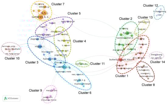 where nmax is the number of publications by the most prolific authors in the field, and N is the publication threshold for core authors. From Table 3, nmax = 48, then N ≈ 5; so, the authors with five or more publications can be defined as core authors. The clustering of core authors was shown using VOSview, with a high number of clusters in the current field of soil nitrogen leaching; there were 14 in total (Figure 6). Among them, Cluster1, Cluster2, and Cluster3 have more than 10 authors, with more publications and better representation.