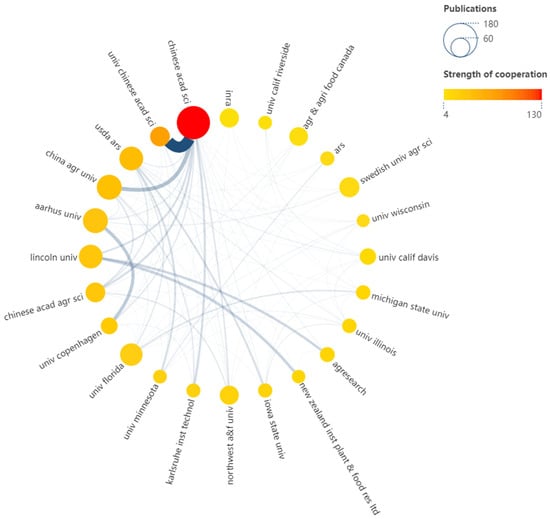 Cooperation between different institutions in the field of soil nitrogen leaching. Each node represents an institution, and the size of the node is proportional to the amount of publishing carried out by the institution. The color of the nodes represents the intensity of cooperation in the institution, with red representing a high intensity of cooperation and yellow representing a low intensity of cooperation. The lines between the nodes indicate cooperation between institutions, with thicker lines and darker colors indicating closer cooperation.