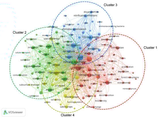 The co-occurrence analysis of keywords gives an idea of the frequency and focus of the research related to the different keywords in the field [101]. A total of 140 keywords with a frequency of occurrence of more than 30 were selected for co-occurrence analysis (Figure 8). It was found that apart from the search words “nitrate leaching”, “nitrogen leaching”, and “soil”, the keywords that appeared more frequently were “management”, “losses”, “model”, “carbon”, and so on, which demonstrated the focus of research in these areas. The keywords can be roughly divided into four clusters (Figure 8).