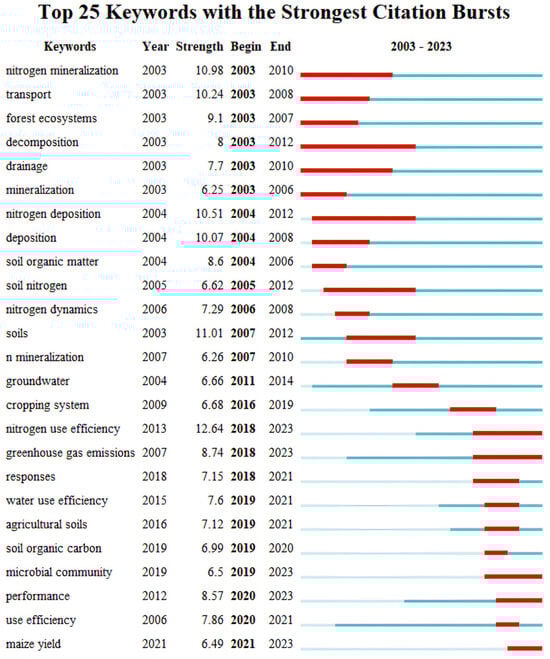 The bibliometric data were analyzed for keyword bursts for the period from 2003 to 2023 (Figure 9). The main keywords that started to burst before 2005 were “denitrification”, “nitrogen deposition”, “decomposition”, and so on, indicating that research in this period focused on the cycling and transformation of nitrogen in the soil, with an emphasis on the formation mechanism of nitrogen leaching. After 2005, keywords such as “nitrogen dynamics”, “groundwater”, and “cropping systems” burst. Soil dynamics are essential to minimise the impact of nitrogen leaching on groundwater and to implement appropriate soil management practices [116]. The research during this period focused on simulation and analysis of the effects of soil nitrogen leaching on groundwater and cropping systems through nitrogen dynamics. In recent years, keywords such as “nitrogen use efficiency”, “greenhouse gas emissions”, “responses”, and “maize yield” have been bursting. These emerging keywords could continue to burst until 2023, indicating that the hotspot of research in recent years will continue into the future and will involve the adoption of rational countermeasures to improve soil nitrogen use efficiency, reduce nitrogen leaching and greenhouse gas emissions, and, at the same time, safeguard the yields of crops such as maize. It is worth mentioning that the ‘microbial community’ continues to burst until 2023, indicating that more and more studies in the field of soil nitrogen leaching have been combined with microbiology and other disciplines in recent years, which is consistent with previous findings [117] and contributes to a more comprehensive understanding of the biogeochemical processes and expands the methods and scope of the study of soil nitrogen leaching.