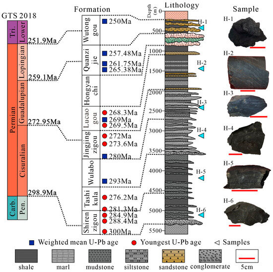 - Yang, W.; Feng, Q.; Liu, Y.; Tabor, N.; Miggins, D.; Crowley, J.; Lin, J.; Thomas, S. Depositional environments and cyclo-and chronostratigraphy of uppermost Carboniferous–Lower Triassic fluvial–lacustrine deposits, southern Bogda Mountains, NW China—A terrestrial paleoclimatic record of mid-latitude NE Pangea. Glob. Planet. Chang. 2010, 73, 15–113. [Google Scholar] [CrossRef]