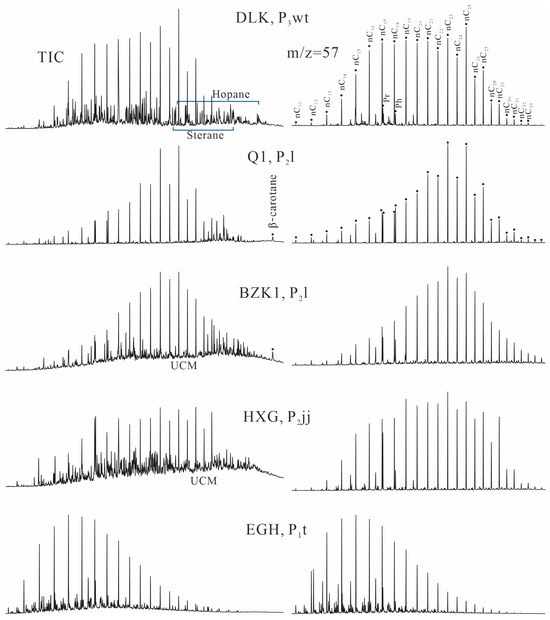 Early Permian samples generally exhibited high TOC values (Figure 3) but displayed extremely low levels of chloroform bitumen “A”. TOC ranged from 0.43% to 2.33%, with an average of 0.90%, and chloroform bitumen “A” ranged from 0.003% to 0.098%, with an average of 0.036% (Table 1). In contrast, samples from the Middle Permian Wulabo Formation and Jingjingzigou Formation showed lower TOC and chloroform bitumen “A” levels, with TOC ranging from 0.40% to 0.68% (average 0.55%) and chloroform bitumen “A” ranging from 0.006% to 0.295% (average 0.123%) (Table 1). The Middle Permian Lucaogou Formation exhibited the highest TOC (Figure 3) and chloroform bitumen “A” values among the studied samples, with TOC ranging from 0.55% to 9.21% (average 3.47%) and chloroform bitumen “A” ranging from 0.013% to 1.060% (average 0.284%) (Table 1). The Upper Permian Wutonggou Formation samples displayed relatively high TOC and chloroform bitumen “A” values, with TOC ranging from 0.85% to 2.20% (average 1.45%) and chloroform bitumen A ranging from 0.082% to 0.212% (average 0.147%) (Table 1).