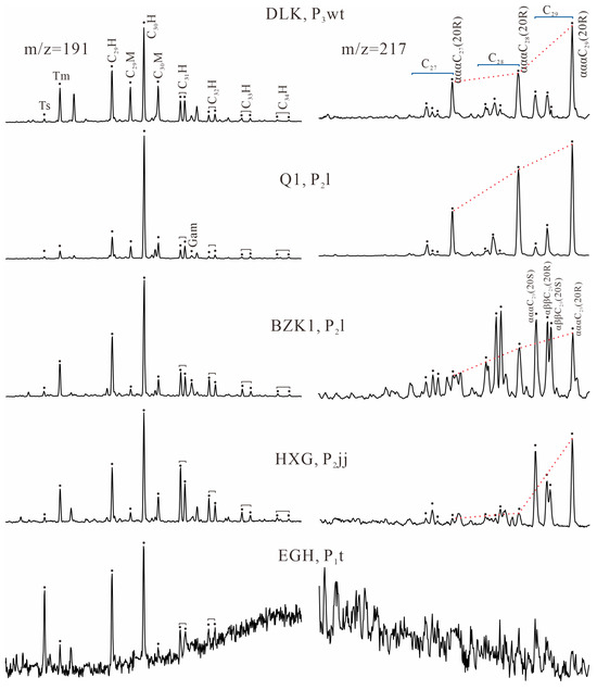 m/z 191 and m/z 217 mass chromatograms of saturated hydrocarbons in the Permian source rocks around Bogda Mountain, Junggar Basin.