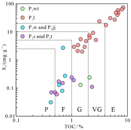 Total organic carbon (TOC) contents versus Rock-Eval S2 peaks (mg hydrocarbons [HC]/g rock) for Permian source rock around the Bogda Mountain, Junggar Basin (adapted from Chen et al., 2021 [54]). P = poor, F = fair, G = good, VG = very good, and E = excellent.