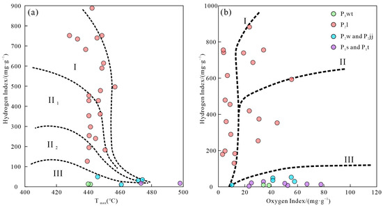Organic matter type of Permian source rock around the Bogda Mountain, Junggar Basin. Plots of the: (a) Hydrogen Index versus Tmax (adapted from Delvaux et al., 1990 [55]); and (b) Hydrogen Index versus Oxygen Index (adapted from Peters 1986 [56]). I = Type I kerogen, II = Type II kerogen, III = Type III keroge.