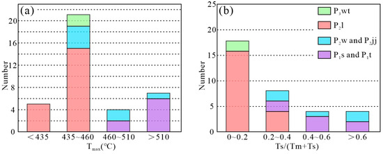 Thermal maturity identification charts of Permian source rock around the Bogda Mountain, Junggar Basin. (a) Distribution histogram of Tmax. (b) Distribution histogram of Ts/(Tm + Ts).