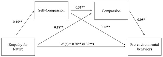 Serial mediation of self-compassion and compassion on the relationship between empathy for nature and pro-environmental behaviors. Coefficients shown are standardized path coefficients. c’ = direct effect; c = total effect. * p < 0.05; ** p < 0.001.