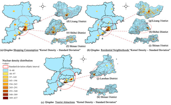 The differences in street characteristics arise from the location of rail transit stations, the types of surrounding land use, and the diverse urban functions they undertake [19]. The street space under the TOD mode can be categorized into three main types: commercial districts, residential districts, and landscape districts, which possess functions such as commercial entertainment, community commuting, and landscape corridors, jointly constructing the commercial and social networks of the city [20,21]. Based on this, the development trends and clustering disparities of three types of points of interest (POIs), namely “shopping and consumption”, “residential communities”, and “tourist landscapes” in Qingdao, were summarized using the kernel density and standard deviation analysis methods in ArcGIS [22,23], and subway stations adjacent to high-density POIs were screened out (Figure 2). It is evident from the degree of kernel density clustering and the delineation of the standard deviation ellipse that the POIs of shopping and consumption and residential communities are concentrated in Li Cang, Shi Nan, and Shi Bei Districts (Figure 2a,b); the POIs of tourist landscapes are concentrated in Lao Shan District and Shi Nan District (Figure 2c). By superimposing the road network and land plots within the region and conducting further screening of specific blocks, the subway stations adjacent to high kernel density areas were determined. Among them, shopping-type stations include Li Cun Station (Figure 2d), Wu Si Square Station (Figure 2e), and Tai Dong Station (Figure 2f); residential-type stations include Xia Wang Bu Station (Figure 2g), Zhong Shan Road Station (Figure 2h), and Yan Er Dao Road Station (Figure 2i); and tourist-type stations include Miao Ling Road Station (Figure 2j) and Qing Dao Station (Figure 2k).