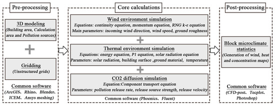 Data measurement and on-site investigation are the most direct methods for obtaining an understanding of the current environmental status. However, mesoscale studies are often restricted by the limited amount of equipment and the resulting limited measurable point data, making it rather challenging to adopt a purely measurement-based approach. CFD simulation offers advantages such as a short computing cycle and intuitive visualization. By setting boundary conditions, it can rapidly simulate a numerical environment similar to the actual situation, providing a superior complement to the measured data [29,30]. The simulation process mainly encompasses three core steps, pre-processing, core computation, and post-processing [31], and the specific procedure is depicted in Figure 3.