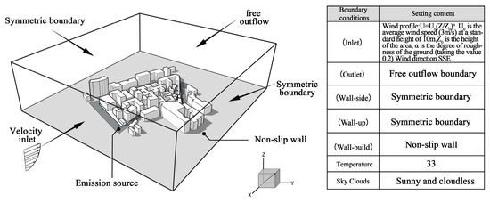 Numerical computation serves as the core aspect of the entire CFD simulation. The microclimate environment simulation is performed within CFD software packages such as Phoenics and Fluent 19.2, and is specifically processed in accordance with the characteristics of the wind environment, thermal environment, and CO2 diffusion simulation. Both the street-level wind-thermal simulation and the CO2 diffusion simulation adhere to Newton’s three laws, namely, fulfilling the RNG k-ε equation, energy equation, and momentum equation [35]. The CO2 diffusion simulation can be solved by applying the component transport model on the basis of the wind-thermal simulation [36]. Based on the establishment of the discrete equation, the discrete definite solution conditions are set, and the boundaries are defined [37]. The velocity inlet boundary serves as the main inlet of the incoming wind; the mass inlet boundary is the inlet of carbon emission sources; the outflow boundary is the free outlet; the building surface and the ground are fixed boundaries, adopting the no-slip wall surface; and the side and top surfaces can employ symmetric boundaries and outflow boundaries (Figure 4). The simulation parameters are set based on the calibration of the initial conditions with the measured values and the published data from meteorological stations to approximate the real urban scenario (the theoretical model mainly focuses on the building layout and temporarily disregards the differences in underlying surface types and the influence of the greening environment).