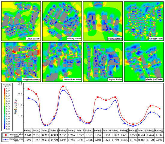 Owing to the simplification during the modeling stage under idealized conditions and the neglect of the influences of microscopic factors, such as the building surface texture and greenery vegetation, the simulated wind speed does not fully align with the actual measured speed. Nevertheless, through the correlation analysis of the measured and simulated values, the calculated root mean square error is 0.0707, and the numerical fluctuations are within the relatively fitted range. This indicates that the simulation results have a certain correlation with the actual measurements, namely, the parameters used in this wind environment simulation experiment are reasonable and the calculation results are reliable.