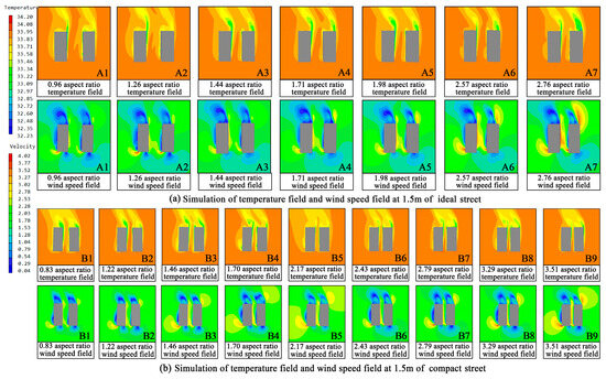 Simulation of temperature and wind speed at 1.5 m in streets with different aspect ratios.