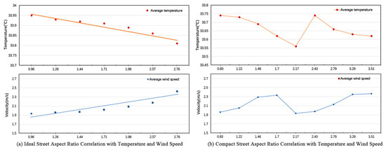 Likewise, by conducting a linear regression analysis of the average temperature and average wind speed of the street (Figure 7b), it is discovered that when the aspect ratio is between 1.7 and 2.43, the temperature and wind speed fluctuate significantly, and a simple linear relationship does not exist between them. The potential reason might lie in the fact that within the narrow spatial scale of the street, as the aspect ratio increases, the shading effect of the street is enhanced, and the area of no wind on the leeward side of the buildings becomes more pronounced, hindering the air circulation and temperature reduction to a certain extent.