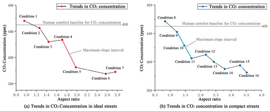 We extracted sixteen sets of data on different street aspect ratios at the vertical section and the corresponding average concentration values and plotted them as a line graph to explore the linear relationship between the two variables (Figure 8). In ideal street scenarios, when the aspect ratio is within the range of 1.26 to 1.98 (approximately 1.3 to 2.0), although the CO2 concentration undergoes a short-term fluctuation, it generally shows a significant downward trend as the aspect ratio increases. In compact street scenarios, when the aspect ratio is within the range of 1.22 to 1.70 (approximately 1.2 to 1.7), the reduction in CO2 concentration is the most pronounced as the aspect ratio increases.