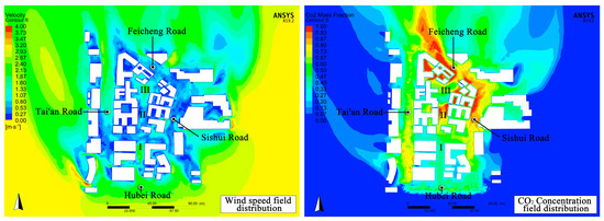 At the overall scale of the block, the dynamic distribution characteristics of the wind speed field, temperature field, and concentration field shown in the microclimate simulation cloud map are summarized. Through appropriate spatial form design strategies and increasing the internal ventilation corridors, air circulation can be effectively promoted, and the CO2 concentration can be diluted.
