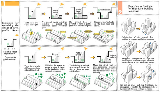 For low-rise blocks, when the buildings on both sides are of the same height, measures such as street colonnades and ground-floor overheads can be adopted to form low-level gray spaces along the street and create low-concentration pedestrian areas. When there is a height difference between the upstream and downstream buildings, forms such as upper-floor cornices and roof terraces can be employed to mitigate the CO2 wall-climbing effect on the leeward side of the upstream buildings facing the street and introduce the incoming airflow from above. High-rise buildings, given their generally shorter setback distances and higher number of floors, can specifically adopt treatment forms such as podium segmentation, the combination of high and low buildings, and overhead sectioning in combination with the form layout and building combination patterns to weaken the wind wall effect and reserve ventilation corridors.
