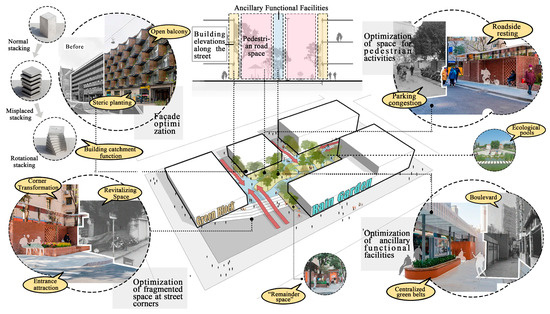 Street-facing buildings provide vertical greenery and shade for the pedestrian space. Approaches such as building layer stagger superposition and rotational superposition can be adopted to create more possibilities for vertical greening and ventilation openings. Facilities like landscape gardens, ecological ponds, and central green belts can be added to the road interface. The evaporation and cooling effects of vegetation and water bodies can be utilized to alleviate the enrichment of exhaust gas concentration and better adapt to climate change. Additionally, it is important to fully explore the “residual space” within the street, including the interstitial spaces between buildings, intersection and corner spaces, and fragmented redundant spaces. Through small-scale renovations and “micro-updates”, the chaotic, cluttered, and negative blocks could eventually become positive demonstration templates, that is, shaping a climate-appropriate, low-carbon, and high-quality carbon sink space.