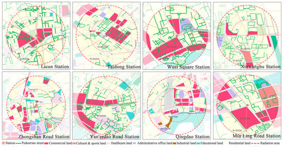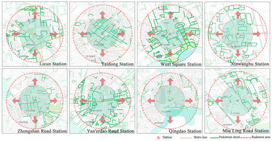 The coordinating role of pedestrian networks should be utilized when organizing the urban spatial layout (Figure 15). Pedestrian spaces should not be limited to connecting small-scale profit-making commercial facilities, but should focus more on the linkage between the station and the space outside the influence range—that is, emphasizing the role of TOD blocks in coordinating public spaces, sports and cultural facilities, residential land use, and other planning systems through pedestrian networks, and jointly forming a TOD green and low-carbon living circle. Such attractive pedestrian network spaces are not just simple transportation systems, but can also serve as gathering places for various public activities and make it easier for citizens to travel green and low-carbon.