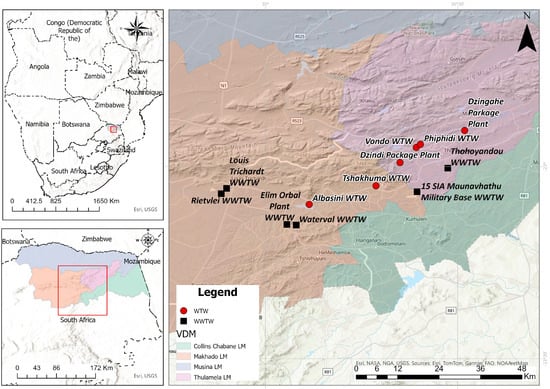 The study was conducted in the Vhembe District Municipality, established in 2000 as a Category C municipality under the Local Government Municipal Structures Act No. 117 of 1998 []. This district encompasses four Category B local municipalities: Collins Chabane, Thulamela, Makhado, and Musina. Located in the northern region of Limpopo province, Vhembe shares its eastern and western borders with the Capricorn and Mopani District Municipalities, respectively []. According to the 2022 community survey by Statistics South Africa, the district covers a land area of 27,969,148 km2 and has a population of 1,653,022. The local municipalities vary in size, with Makhado covering 8311 km2, Thulamela 2894 km2, Musina 11,297 km2, and Collins Chabane 5467 km2 []. The district has 28 wastewater treatment works and 21 water treatment works, of which 13 are not owned or managed by the Water Services Authority []. For this study, Thulamela and Makhado municipalities were selected, with populations of 575,929 and 502,397, respectively (Figure 1) [].