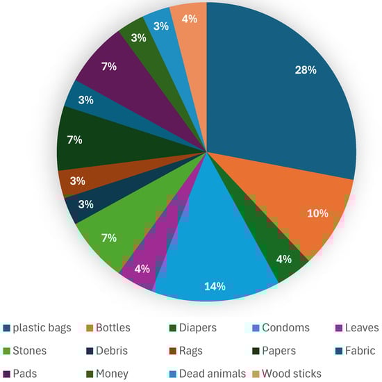 Participants expressed great concern when asked if their treatment facilities could remove even the smallest plastics, or microplastics. They stated that current treatment technologies are limited, especially when screening out microplastics, which frequently bypass initial filtration processes. This is supported by a study conducted by Mabadahanye et al. [], which found that WWTPs in various countries continue to release microplastics. For instance, one WWTP in Lithuania had concentrations of 994.0 microplastics per litre (MP/L) in its effluent, while another in Spain had a concentration of 38.6 MP/L. These findings indicate that these treatment plants are not designed to effectively remove microplastics, as they cannot eliminate them entirely. One participant shared this concern by stating that their treatment plant does not effectively remove microplastics hence larger plastics are usually captured during screening. Participants also mentioned the items usually taken out during the screening process, such as sticks, plastics, condoms, bottles, and other trash (Figure 2). The effective screening and retention of these items upstream in the treatment process is a positive sign, as it indicates that the facility is managing solid waste efficiently. By removing larger debris early on, the treatment plant can prevent damage to equipment and enhance the overall effectiveness of the wastewater treatment process.
