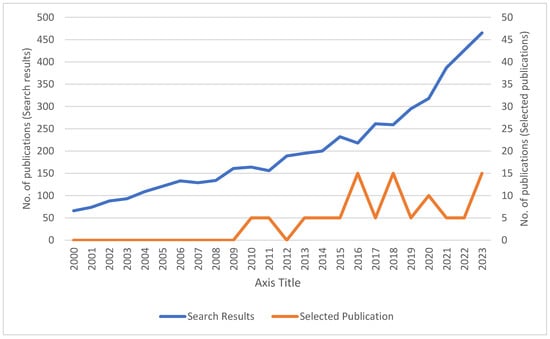Yearly representation of search results and selected papers for keywords from 2000 to 2023.