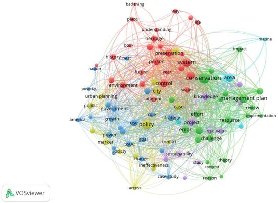 For the network map shown in Figure 3, a cluster resolution of 1.0 was applied, and a minimum of three items was required to form a cluster. The nodes (circle) represent the keywords of the search results, and their size indicates the number of times that these words are repeated, from most common to least frequently appearing in the literature. The result indicates that the selected keywords did not appear prominently on the map, but only a limited number appeared alongside many other terms. This confirms the diversity of the keywords in articles on cultural heritage management. It also shows the weak presence of keywords related to tangible heritage management and conservation plans. The diversity of the keywords also indicates the fragmentation of the focus of the articles on various aspects of heritage management. This explains the limited literature selected compared to the vast literature produced by the three selected search engines.