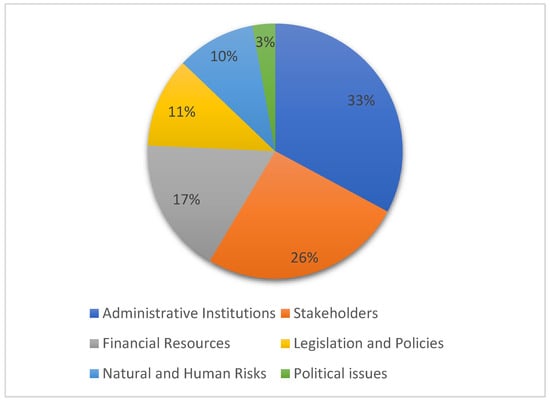 Based on the articles collected and reviewed in this research, 29 factors affecting heritage management’s effectiveness were identified (Table 4). These factors have also been classified into six main categories: administrative institutions, local society and stakeholders, financial resources, legislation and policies, natural and human hazards, and political issues. Figure 4 shows the percentage of references to each category in the selected articles.
