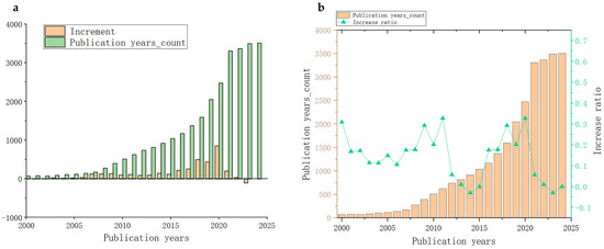 The number of annual publications on research on climate action from 2000 to 2024. (a) Number of publications per year from 2000 to 2024 and its annual growth rate. (b) Number of publications per year from 2000 to 2024 and its annual growth rate.