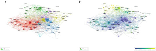 Co-author network maps of countries and regions. (a) Network visualization map (document weights); (b) overlay visualization map (document weights).