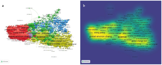 Journal co-citation network. (a) Journal network visualization map; (b) journal density map.