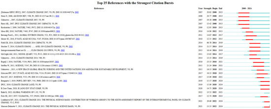 As can be seen from Figure 6, the longest time for the literature citation outbreak was 5 years and the shortest time was 2 years. These 25 articles were all published after 2007 and have been cited since 2008. Among them, there were seven papers on the topic of “climate change”, and it was precisely in order to deal with “climate change” and its effects; there was an urgent need to study “climate action”. Thus, climate change was a major problem facing mankind, and climate action was an important solution for mankind.