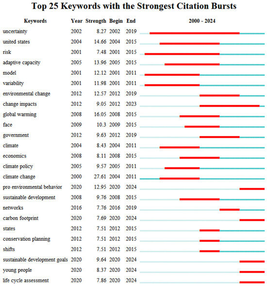 Keyword reference bursts were those keywords that had a sharp increase in the number of citations. Burst detection was a valuable analytical technique that aided in discovering keywords gaining significant attention in relevant scientific fields within a specific timeframe. Keyword outbursts, an important indicator, helped to identify emerging or declining research trends in a given field [75]. Therefore, keyword analysis can reveal many interesting topics. To gain a deeper understanding of the dynamics of climate action research and to explore detailed research directions, CiteSpace was used to identify emerging keywords. CiteSpace detected 25 keywords with the strongest reference bursts (Figure 8) (year parameter settings for each article: 1; Node type: Key words; top N per tablet: 50; The first N%: 10%). Keywords that cited the strongest outbreaks were divided into two phases based on the outbreak year, namely phase I (red) and phase II (green). In the field of climate action, some hot research topics have attracted great attention. The most frequently cited keywords mean that certain words have changed significantly in a short period of time, reflecting emerging research topics and cutting-edge directions. Keywords that cite eruptions in the field of climate action were sorted by starting year, as shown in Figure 8. The research frontier for climate action was largely theoretical in its early stages. Some papers focused on the need for climate action. For example, the keywords of the previous decade were global warming (2008), variability (2011), climate change (2004), sustainable development (2008), uncertainty (2002), and governance (2012). In recent years, carbon footprint (2020), pro environmental behavior (2020), sustainable development goals (2020), young people (2020), and life circle assessment (2020) were new research topics.