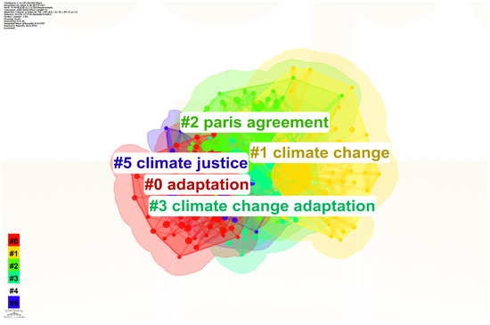 Hot topics were not enough to reflect the research trends in the academic field, because the “timeliness of different literatures” was not taken into account [81]. To address this, we used CiteSpace to perform a cluster analysis of keywords to identify emerging trends and cutting-edge keywords in the field of climate action. Cluster analysis was a valuable tool for understanding the whole picture of the field from different perspectives [81]. In CiteSpace, we set the parameters as follows: Node type: keyword; g-index: k = 10; Top N: 20, years per slice: 1. Then, we obtained the keyword clustering network diagram (Figure 9), where modularity Q = 0.36 and weighted mean silhouette S = 0.6787 > 0.5. These significant values indicated that the clustering effect was good and the outline was clear. CiteSpace generated seven clusters. Some terms may overlap between different categories.