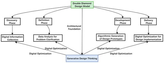 In summary, the integration of the Double Diamond model establishes a robust theoretical framework for generative design thinking. This approach retains the fundamental structure and process of the Double Diamond model while optimizing and reconstructing it through digital methods to make the design process more systematic and scientific, as illustrated in Figure 2.