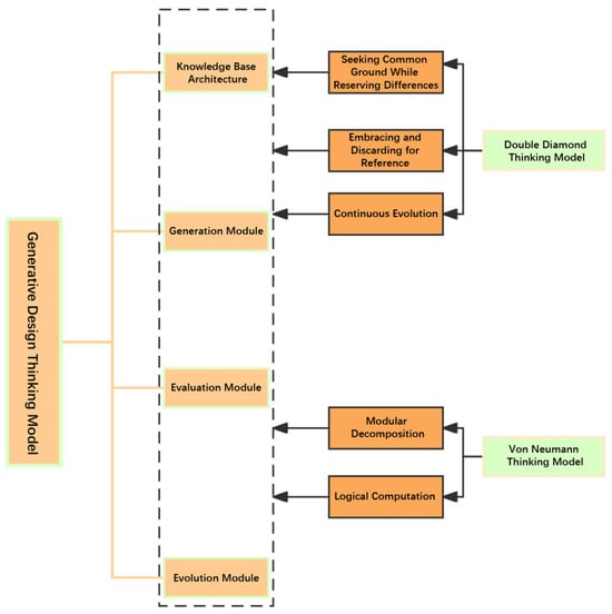 The generative design thinking model is a process framework built upon the Double Diamond design model and the von Neumann computing system model. The Double Diamond model provides the overall thinking logic of “innovative divergence” and “continuous evolution” for the generative design thinking model, while the von Neumann thinking model offers the technical pathway of “modular decomposition” and “logical computation”. This integration is illustrated in Figure 4.