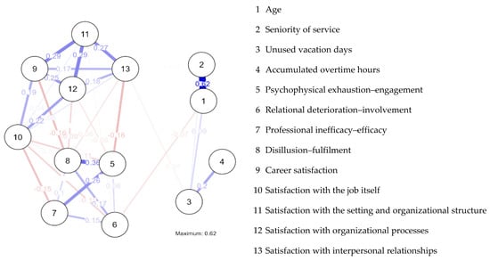 Regarding expected influence (i.e., how much a node is able to influence the others in both a direct and indirect sense), a small influence of the variables ‘accumulated overtime hours’ (node 4) and ‘satisfaction with the job itself’ (node 10) can be observed. Conversely, the highest influence can be seen for career satisfaction, satisfaction with the organizational setting and structure, and satisfaction with the organizational processes (nodes 9, 11, and 12, respectively). Going further into the relationships between the individual nodes of the evaluated psychological dimensions (Figure 1), we noted the inverse relationship between node 5 (psychophysical exhaustion–engagement) and node 13 (satisfaction with interpersonal relationships), the inverse relationship between node 9 (career satisfaction) and node 8 (disillusion–fulfilment), and the inverse relationship between node 7 (professional inefficacy–efficacy) and node 10 (satisfaction with the job itself).