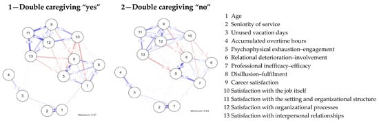 For group 1 (double caregiving “yes”), we obtained 13 nodes, with 34 non-zero edges out of 78 (sparsity: 0.564); for group 2 (double caregiving “no”), we observed 13 nodes, with 38 non-zero edges out of 78 (sparsity: 0.513).