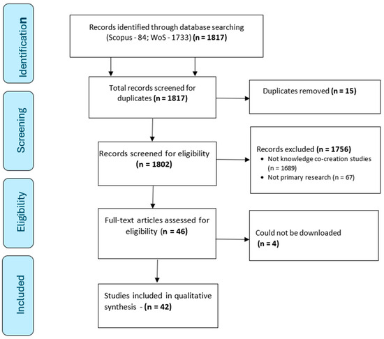 Data extraction began with merging the references using Zotero, which totalled 1817 articles. Of these, 15 duplicates were removed. The titles and abstracts of the remaining 1802 were screened, and 1754 did not meet the inclusion criteria: these included those that were not knowledge co-creation (1689 articles) and those that were not considered primary research (63 articles). The remaining 46 articles were further checked for accessibility, and there were some that could not be downloaded after their abstracts had been read (4 articles). Finally, 42 articles were finally included in the analysis (see Figure 1 and Supplementary Material Table S1).