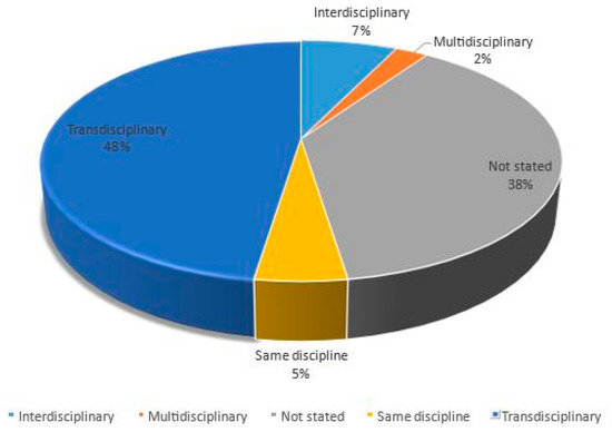 It has been posited that knowledge co-creation is directed at crossing boundaries by bringing together different categories of experts and practitioners who bring along their respective knowledge bases and interests, thereby enhancing the representation of dissimilar social practices, networks, organisations, and groups [125,126]. We observed that the majority (48%) of the studies reviewed that stated the disciplinary compositions described themselves as transdisciplinary. Only 7% and 2% were interdisciplinary and multidisciplinary, respectively. The articles that did not capture the disciplinary nature of collaboration constituted 38% of all those reviewed (see Figure 2). These insights are consistent with the perspectives of scholars who view knowledge co-creation as a facet of the broader transdisciplinary field. For instance, Krellenberg and Koch [127] claim that knowledge co-creation is a segment of transdisciplinary and participatory research approaches.