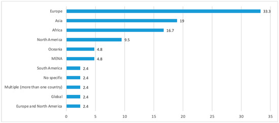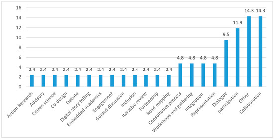 The data show that the range of international collaboration on co-created projects, especially North-South collaboration research, remains quite narrow. Out of 42 articles included in the analysis, 11 (26.2%) involved collaborative engagement among researchers in more than one country, while 29 (69%) involved researchers in a single country. Among those that involved researchers from different countries, six (14.3%) were collaborations between searchers in the global north and those of the global south. Two (4.8%) did not clearly define the projects’ location as they collaborated and collected data at global conferences and workshops. These reveal that the United Nations [128] and UNESCO [129] call to integrate local and regional concerns into the development process and deepen the engagement with local expertise and regional networks has yet to receive an adequate response. Figure 3 summarises global regions where the co-created projects reported in the articles were implemented. Most of them were implemented in Europe (33.3%), followed by Asia (19%) and Africa (16.7%). The South American region recorded the lowest with 2.4%.