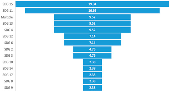The level of knowledge co-creation in sustainable development is inconsistent across the goals. The review of the articles revealed that most co-created projects were implemented around sustainable cities and communities (SDG 15), which recorded 19.04% of the articles reviewed. This was followed by topics around life on land (SDG 11), which recorded 16.66%. SDGs 4 (quality education) and 13 (climate action), and those that captured multiple SDGs, recorded 9.52%, respectively, while SDGs 10 (zero hunger), 8 (decent work and economic growth), and 17 (global partnership) are among the least with 2.38%, respectively (see Figure 4). The absence or limited number of co-created projects in some critical goals, like goals 1, 5, 7, 8, 9, 14, and 17, demands further examination to unravel the reason for the gap and to inspire action in the direction of these goals.