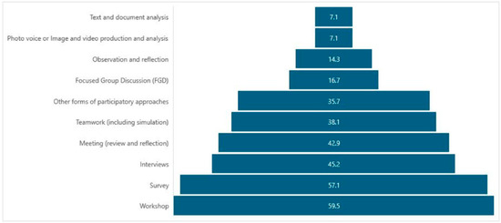 The methods of engagement and data generation that promote co-creation were mostly supported by the qualitative research approach. The review of the articles shows that methods employed that support co-creation include workshops (59.5%), surveys (57.1%), interviews (45.2%), meetings (42.9%), different forms of engagement described as teamwork (38.1%), and various kinds of participatory approaches, including gaming (35.7). Photovoice and text/document analysis (7.1%) were the least employed (see Figure 5). The following section discusses these and other findings and their implications.