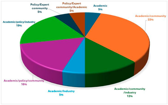 Here, we report the pattern of engagement in the articles, that is, how participants were invited to participate in the project, as reported in the articles. The review shows that collaboration between academics and the local community where the project was implemented, or people affected by the phenomenon under study (33% of the studies), was the predominant form of engagement, followed by academic and policy actors (government) and industry collaboration (19%). Collaborations involving academics, policy actors, and the community recorded 16% (see Figure 6 for the summary of the categories). These categories reveal who participated in the co-creation processes. The academics played a prominent role in initiating the process and engaging other stakeholders, so they were largely listed first in most collaborations. Policy-initiated collaboration was among the least, while none of the collaborations were observed to have been initiated by the community (see Figure 6).