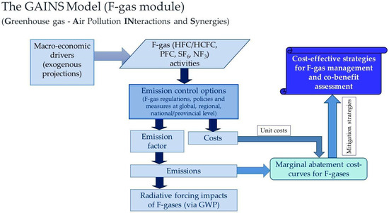 The Greenhouse Gas–Air Pollution Interactions and Synergies (GAINS) model developed by the International Institute for Applied Systems Analysis (IIASA) has previously been used to produce detailed future scenarios for HFC emissions extending to 2100 [3,40,64], which have fed into climate models to assess potential impacts on global warming [10,65,66,67,68,69]. This study employed the GAINS modeling framework to assess the mitigation potential of LRM strategies. A brief description of the GAINS model is provided in the Supplementary Information. For a full explanation of the GAINS model, please refer to ref. [70,71]. Figure 2 illustrates the step-by-step process for modeling F-gas emissions within the GAINS framework [3].