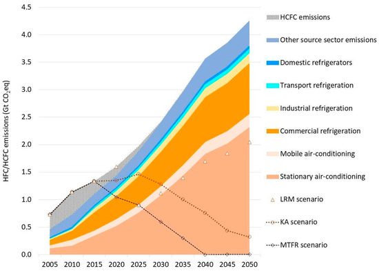 - Velders, G.J.M.; Fahey, D.W.; Daniel, J.S.; McFarland, M.; Andersen, S.O. The large contribution of projected HFC emissions to future climate forcing. Proc. Natl. Acad. Sci. USA 2009, 106, 10949–10954. [Google Scholar] [CrossRef] [PubMed]