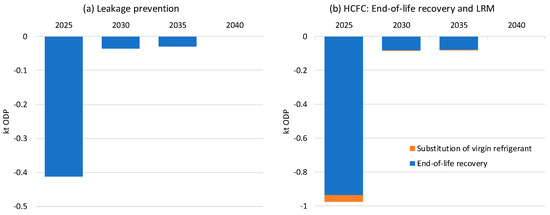 LRM can help to reduce ozone depletion by preventing the release of ODSs into the atmosphere. Even though the phaseout of most ODSs under the Montreal Protocol is in the advanced stages, ODS refrigerants are still being used in legacy equipment around the world. In the past, commonly utilized HCFCs included HCFC-22 (mainly as a refrigerant), in cooling applications. Even though new RACHP equipment is now prohibited from using HCFC refrigerants in many parts of the world, the refrigerant banks still contain significant quantities of HCFC-22 because, once installed, RACHP equipment can remain in use for anywhere between 10 and 25 years, depending on the equipment type. Figure 4a presents the ozone benefits in terms of HCFC mitigation using the pre-KA and LRM scenarios, primarily in relation to HCFC-22, due to leakage prevention using the methodology outlined in Section 2 above. Taking an Ozone Depletion Potential (ODP) of 0.055 for HCFC-22 [38], effective leakage prevention is anticipated to yield cumulative reductions in HCFC emissions totaling 1.6 kt ODP from 2025 to 2040 (Figure 4a). Figure S2a in the Supplementary Information details the annual ozone benefits from leakage prevention during this period.